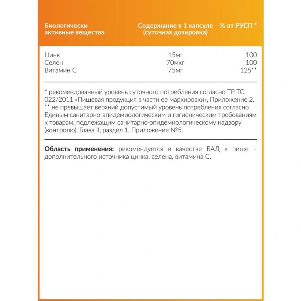 Цинк + Селен с витамином С — это комплекс минералов для укрепления иммунитета, повышения сопротивляемости организма к инфекционным заболеваниям, а также поддерживания здоровья сердечно-сосудистой системы, состояния кожи, волос и ногтей. Цинк — одно из немногих веществ, которое влияет одновременно на все звенья иммунитета человека. Он повышает выработку интерферонов — белков, которые первыми встают на защиту организма против инфицирования вирусами, бактериями и другими микроорганизмами. Недостаток цинка негативно сказывается на всем организме. Мишенью дефицита становятся все органы и системы одновременно. Цинк необходим для роста и деления клеток, развития костной ткани, процессов регенерации, репродуктивной функции, развития мозга и поведения. При недостатке цинка появляются ранняя седина, перхоть, а также равномерное выпадение волос по всей голове. Цинк способствует усвоению белка и считается главным микроэлементом для кожи и волос. Селен — является ключевым элементом для антиоксидантной системы организма человека, функционально связан с обменом йода, цинка и других питательных веществ, регулирует усвоение и расход в организме витаминов А, С, Е и К. Дефицит селена повышает риск развития инфаркта, инсульта, онкологических заболеваний. Ухудшается работа иммунной и эндокринной систем. Витамин С играет важную роль в регуляции окислительно-восстановительных процессов, обладает антиатерогенными, антиканцерогенными, антигипертензивными, противовирусными, антигистаминными, иммуномодулирующими, офтальмозащитными свойствами, является фактором защиты организма oт последствий стресса.